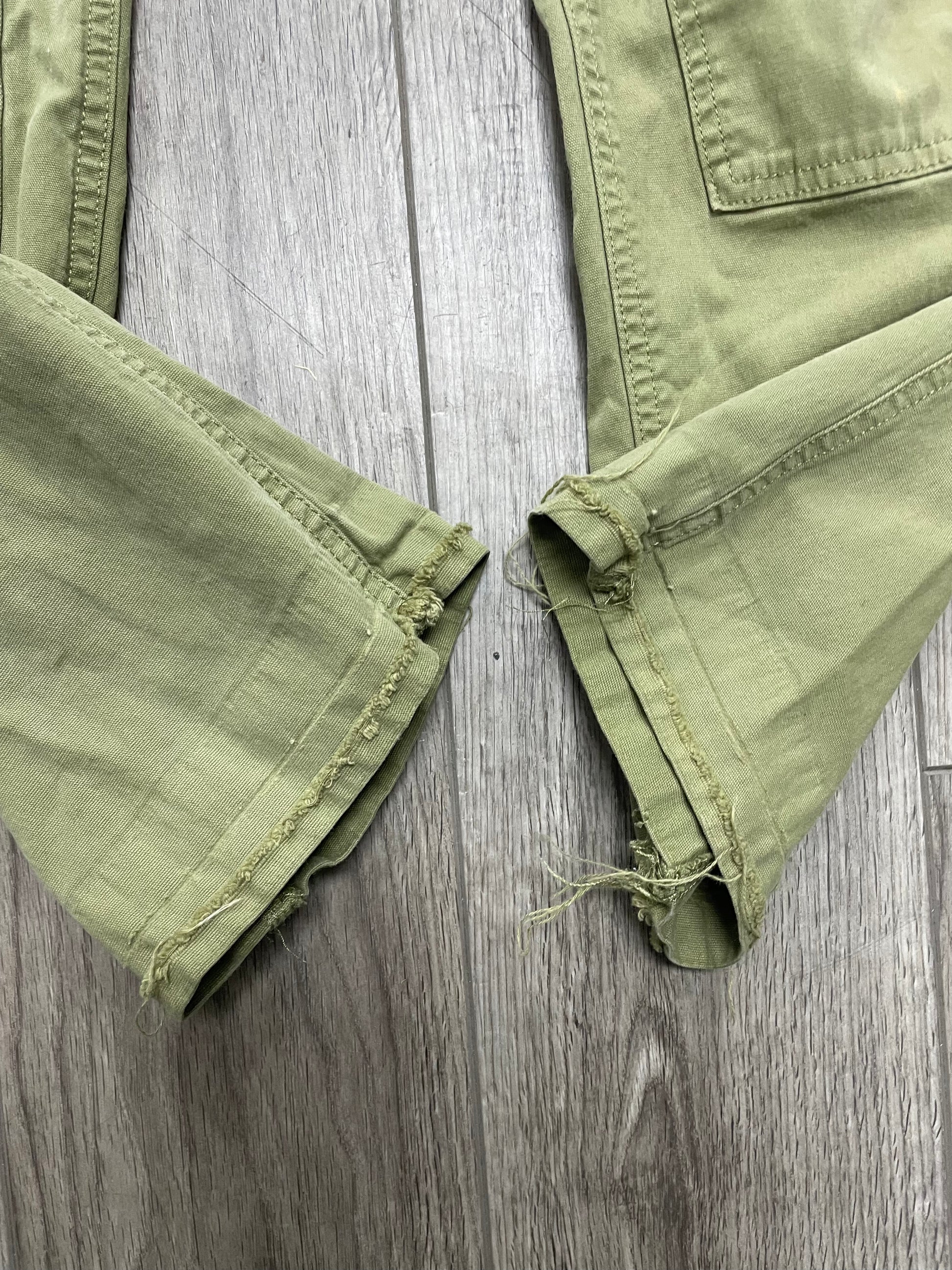 In fair condition, bottom hems undone and has some discoloration throughout